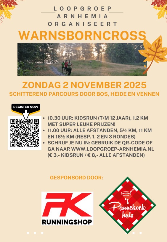 De Loopgroep Arnhemia traint al jarenlang vanuit sporthal De Laar; iedere dinsdag- en donderdagavond starten we daar met een groep enthousiaste lopers. Daarnaast organiseren we elk jaar de Warnsborncross, waarbij we proberen zoveel mogelijk lopers aan de start te krijgen. Daarom, lijkt u dat leuk, zo’n cross en wilt u deelnemen? Dan kunt u zich daarvoor inschrijven met een QR-code of op de website van Loopgroep-Arnhemia. U ziet daar ook meer informatie over de cross en de loopgroep. Voor de QR-code zie de flyer van de cross hieronder: