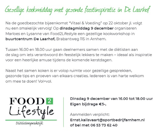 Ah, de feestdagen naderen weer en over het algemeen is dat een periode waarin we ons te buiten gaan aan allerlei lekkere hapjes en drankjes, met eventueel ook het verslinden van een kalkoen tussendoor, en eigenlijk komt het er op neer dat we met al die gezelligheid ertoe neigen toch wat meer naar binnen te werken dan goed voor ons is. Heel informatief is dan de kookworkshop gegeven door diëtisten Marloes en Lysanne, waarin zij uitleg geven over verantwoorde maar lekkere hapjes en gerechten tijdens de feestdagen. Deze workshop wordt gehouden dinsdagmiddag 9 december a.s. in De Laarhof, Brabantweg 115 in Arnhem (lokatie achterzijde Sporthal Laar West). Hieronder meer informatie over deze workshop: