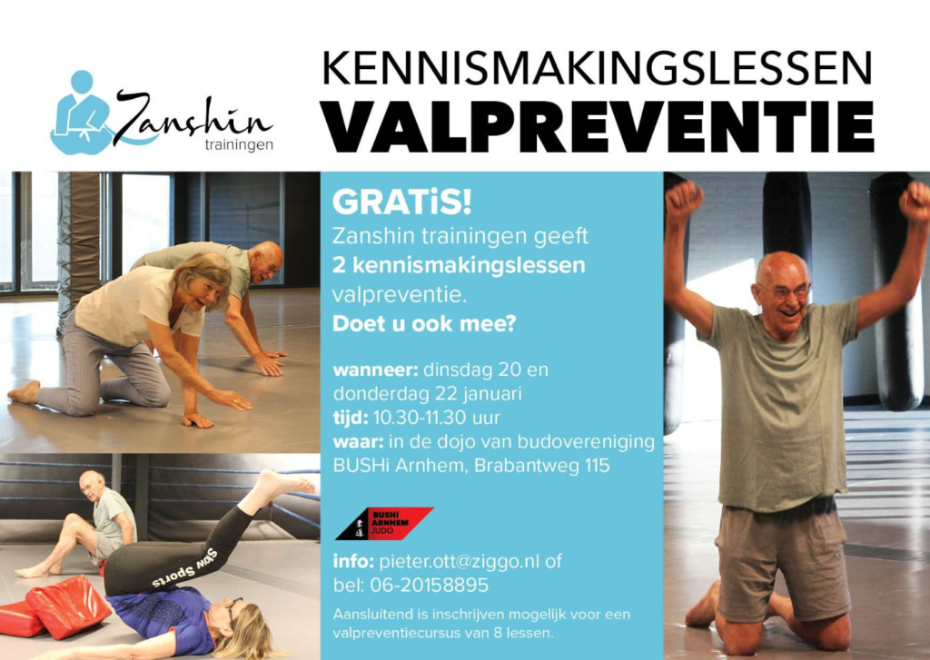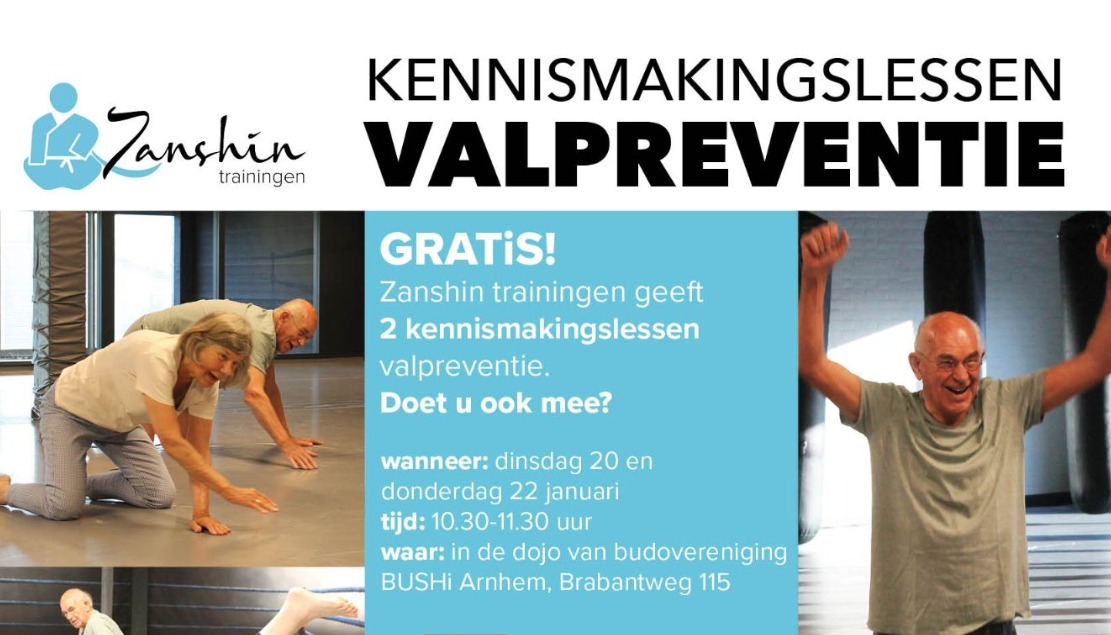 Op dinsdagochtend 20 januari 2026 en donderdagochtend 22 januari 2026 verzorg ik van 10:30 tot 11:30 in de dojo van BUSHi Arnhem (Brabantweg 115) opnieuw TWEE KENNISMAKINGSLESSEN VALPREVENTIE. Voor senioren is dit een ideale gelegenheid om in een veilige omgeving een eerste stap te zetten om weer meer te bewegen en daar ook plezier in te hebben en te houden.