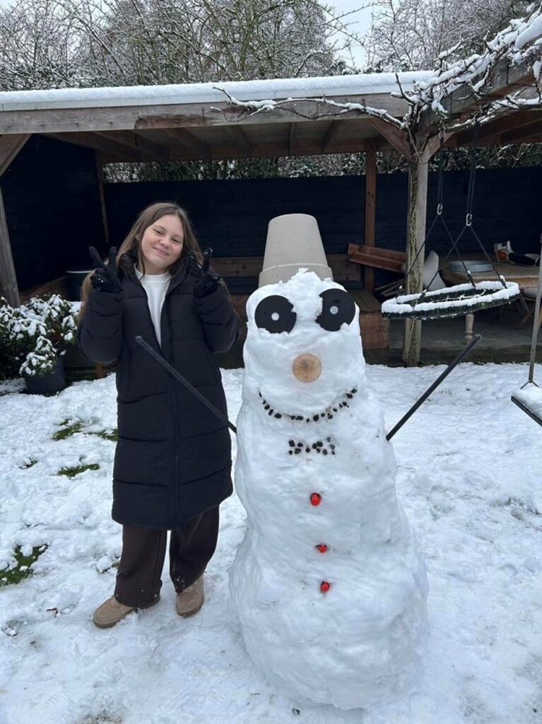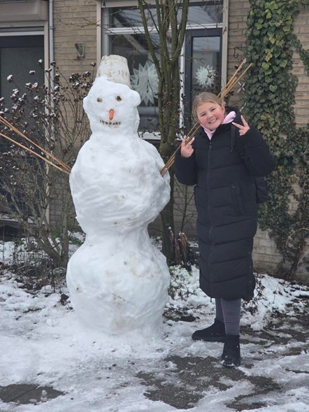 Het had die ene nacht gesneeuwd, niet een klein beetje maar Super veel! Ik keek uit het raam en ik kon bijna mijn eigen fiets niet meer zien onder die witte dikke laag. Maar ik woon dicht bij school dus ik kon lopen, maar in zo’n dikke laag?! Buiten kraakte de sneeuw onder mijn schoenen. Mijn adem was wolkjes en mijn wangen prikten. Maar dat boeide even niet, sneeuw is super leuk! Ik liep mijn straat halverwege uit en zag dat mijn buurjongens een iglo hadden gemaakt! Ik dacht echt zo van: ‘dat wil ik ook maken’ maar ik moest naar school. In de pauze op school kon je kiezen uit: sneeuwballen gevecht, sneeuwpop maken of andere sneeuw dingen doen. Ik ging voor sneeuwballen gevecht! Super leuk is het!! Na 5 minuten was ik er wel een beetje klaar mee en ging ik met mijn vriendinnen een sneeuwpop maken! En we gingen ook stiekem Frozen spelen, hahahaha: ik ben 11, en het is nog steeds super grappig en leuk om te doen!