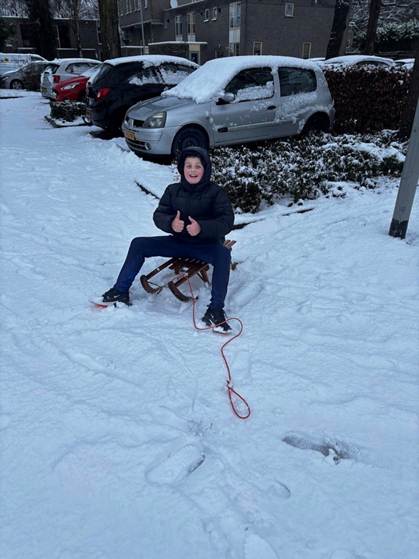 Het was ook heel glad op de wegen dus daarom was het advies om thuis te blijven die woensdag, dus had mijn school De Laarhorst gezegd dat we naar huis mochten. Wij waren natuurlijk blij: sorry juffen. Thuis gingen we eten en met de sneeuw spelen. Mijn hobby is voetballen maar dat is moeilijk in de sneeuw. Ik heb het wel gedaan, maar het is niet zo handig, want ik viel de hele tijd in de sneeuw. Dan word je heel erg nat en dan heb je het koud. Het was vooral lekker om thee of chocolademelk met slagroom te drinken, dan word je lekker warm. ’s Avonds ging ik lekker in mijn stoel zitten en naar het sneeuwen kijken, het leek wel een sneeuwstorm. We zijn de rest van de dagen wel naar school geweest. Op school hadden we een gebied waar je sneeuwballen gevecht kon doen, maar je mocht niet op de hoofden, dat is ook wel logisch. Die ochtend toen ik wakker werd en uit me raam keek, was het helemaal wit, heel mooi. Meteen me jas aangedaan en een mooie sneeuwpop gemaakt.