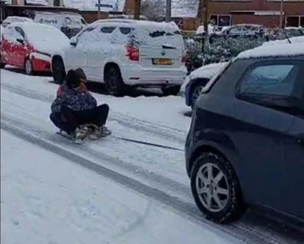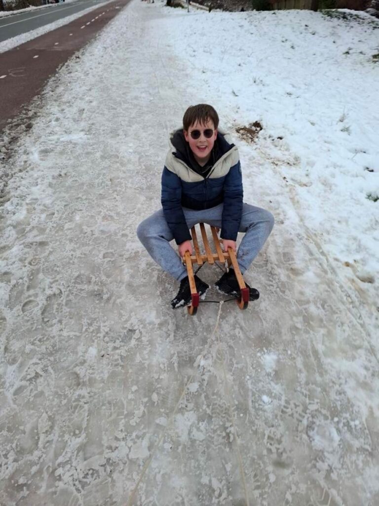 Een keer toen ik naar school fietste gleed ik uit en toen hapte mijn stuur als een slang om mijn been mee, ik kwam nog even bij van de schrik en toen zei mijn moeder: ‘We gaan met de auto!’, hmm.. Heerlijk was dat, lekker opgewarmd in de auto zitten, met muts op en handschoenen nog aan. Vergeleken met buiten in de koude sneeuw voelde ik mij super verwend in de auto. Dus toen de volgende dag dacht ik: ‘Ik ga echt niet meer fietsen!’ maar de auto was ook niet echt een optie. Dus toen werd het ‘De Slee’. Mijn moeder is altijd super creatief, dus ‘De Slee’ kreeg sterrenlampjes! En dus begonnen ik en mijn moeder aan de ‘Lange’ tocht, van maar een kwartiertje. Ik was heel erg aan het stressen van: We komen te laat!! En: ik kom niet op tijd op school! Maar ik kwam dus wel op tijd op school. Dus de schooldag begon. Verder op school was er niet echt wat gebeurt, en nu? Nu gaat de sneeuw al weg. Maar krijgen we misschien een comeback? We zullen zien!