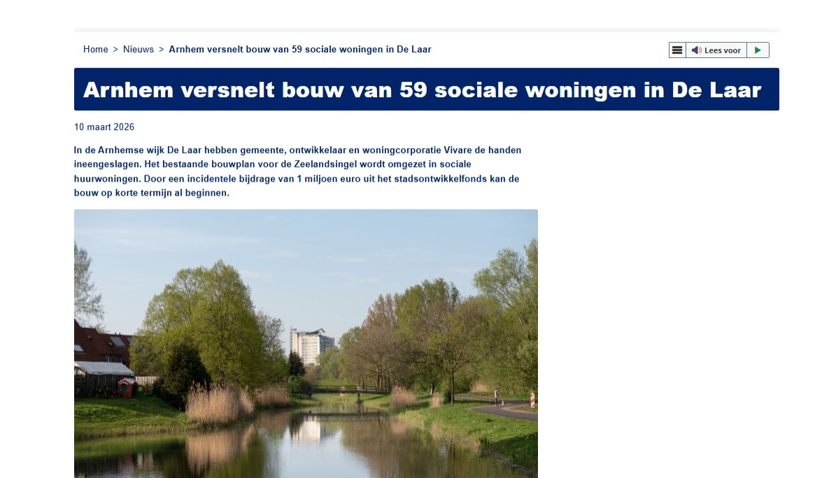 In de Arnhemse wijk De Laar hebben gemeente, ontwikkelaar en woningcorporatie Vivare de handen ineengeslagen. Het bestaande bouwplan voor de Zeelandsingel wordt omgezet in sociale huurwoningen. Door een incidentele bijdrage van 1 miljoen euro uit het stadsontwikkelfonds kan de bouw op korte termijn al beginnen. Zie verder het bericht achter deze LINK
