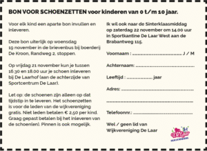 Wil je zaterdag ook naar Sinterklaas en zijn Pieten? Dan moet je de dag ervoor je schoen zetten. Dat kan alleen wanneer je onderstaande bon of een kopie ervan uiterlijk op woensdag 19 november in de brievenbus bij Boerderij De Kroon aan de Randweg 2 stopt. Deze bon kan dus ook vanaf de website wijkdelaar.nl geprint worden. Graag voor elk kind een aparte bon printen, invullen en inleveren.